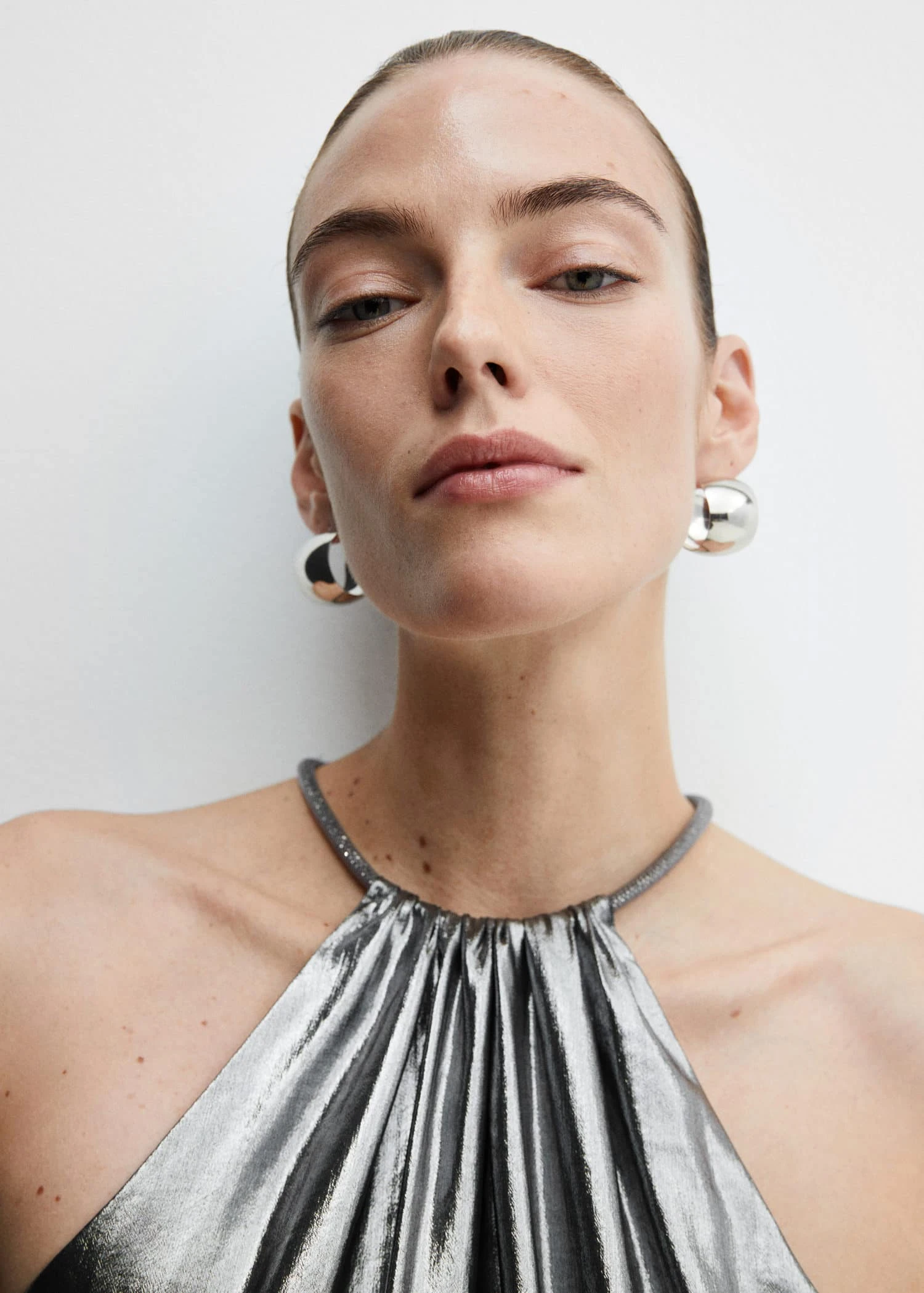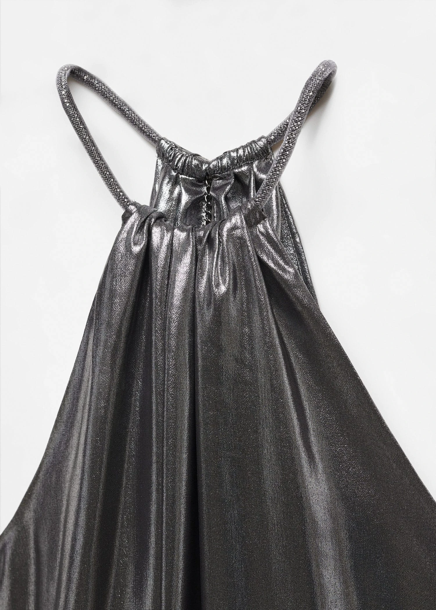 tissu fluide, effet metallise, droit, emmanchures americaines, detail col rigide metallique, sans manches, fermoir a chainette et mousqueton, collection fetes et ceremonies.Composition: 100% polyester
