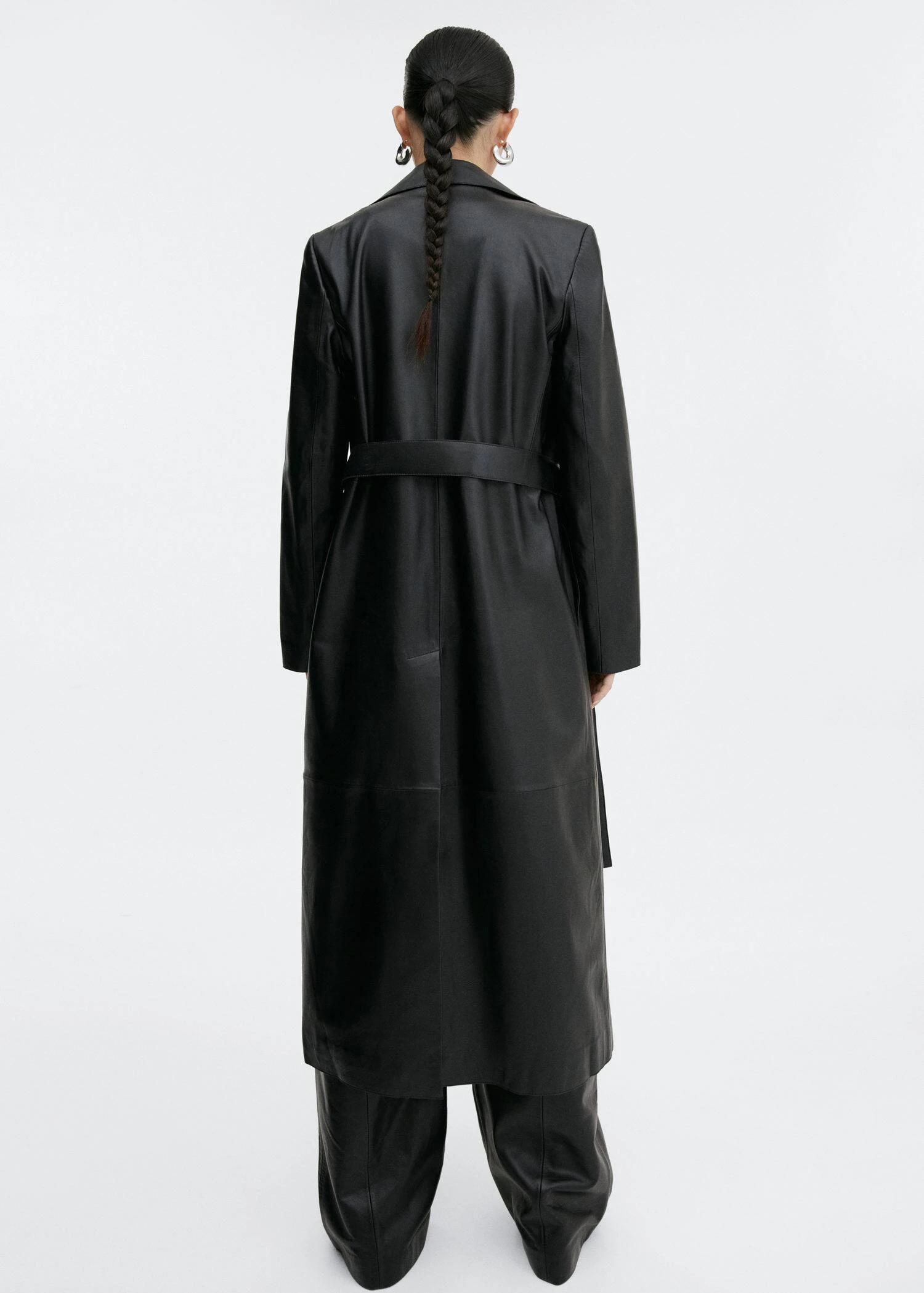 collection selection, tissus et confection de qualite superieure, 100 % cuir ovin, structure, coupe longue, croise, col a revers, manches longues, deux poches laterales, fermeture boutonnee sur le devant, fermeture a nouer, passants pour la ceinture, ouverture a l’arriere, doublure, une selection de pieces qui vous accompagneront lors du retour au bureau. confectionnee avec des matieres de qualite pour creer une garde-robe feminine et contemporaine pour votre quotidien.