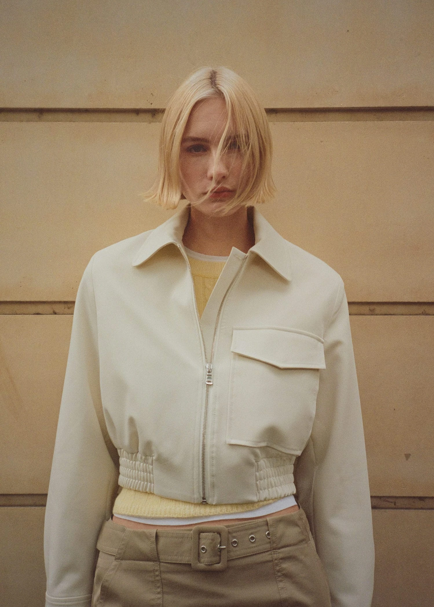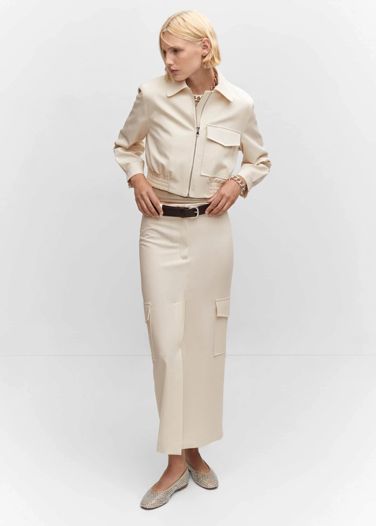 style bomber, design cargo, coupe droite, style crop, col chemise, manches longues boutonnees, poche cargo, fermeture eclair sur le devant, bas elastique, doublureComposition: 76% polyester,17% viscose,7% elasthanne. Doublure: 52% viscose,48% polyester. Doublure manches: 52% viscose,48% polyester. Doublure poches: 52% viscose,48% polyester