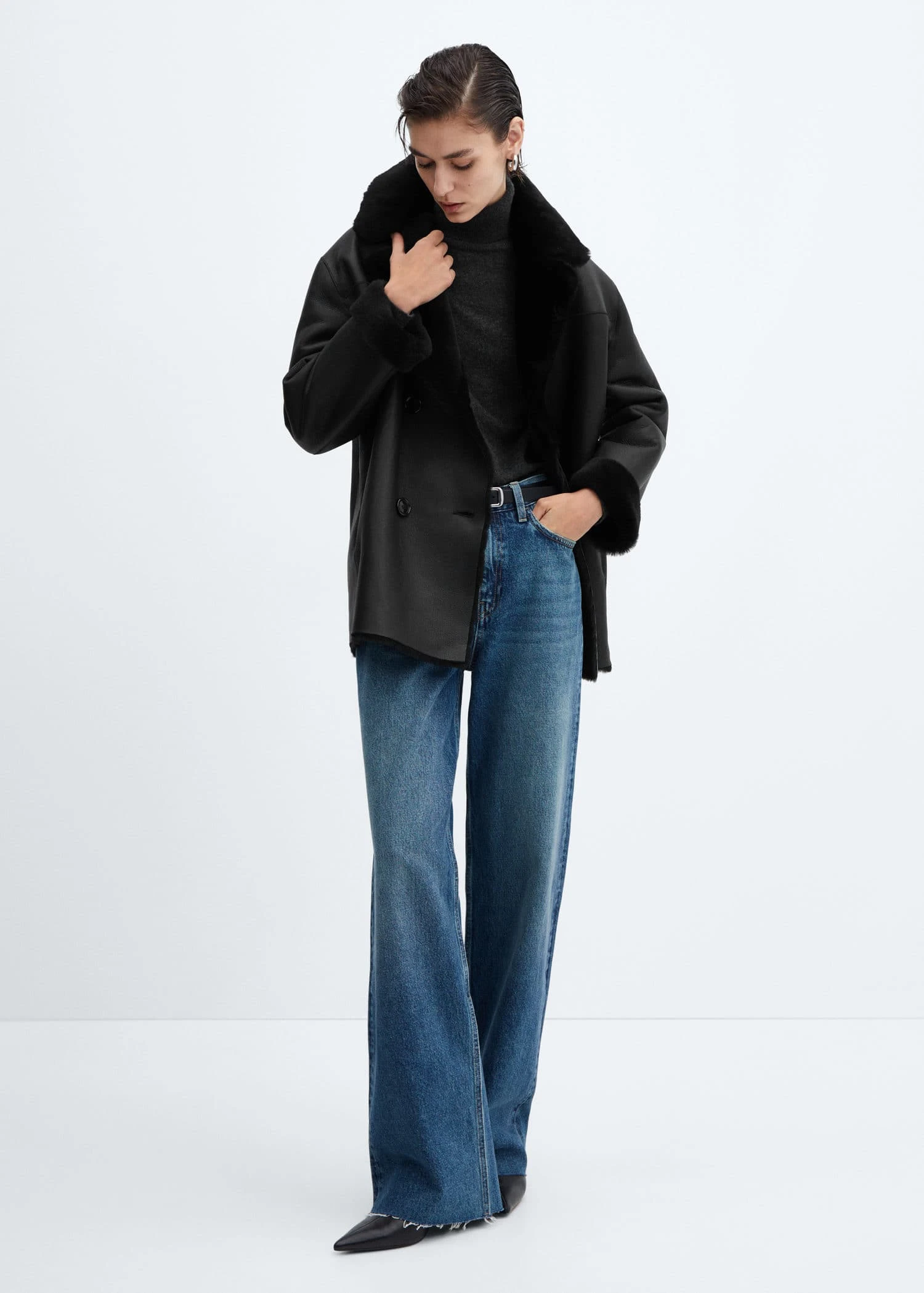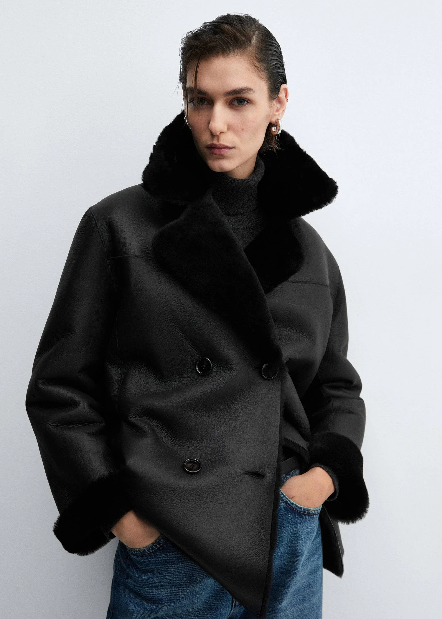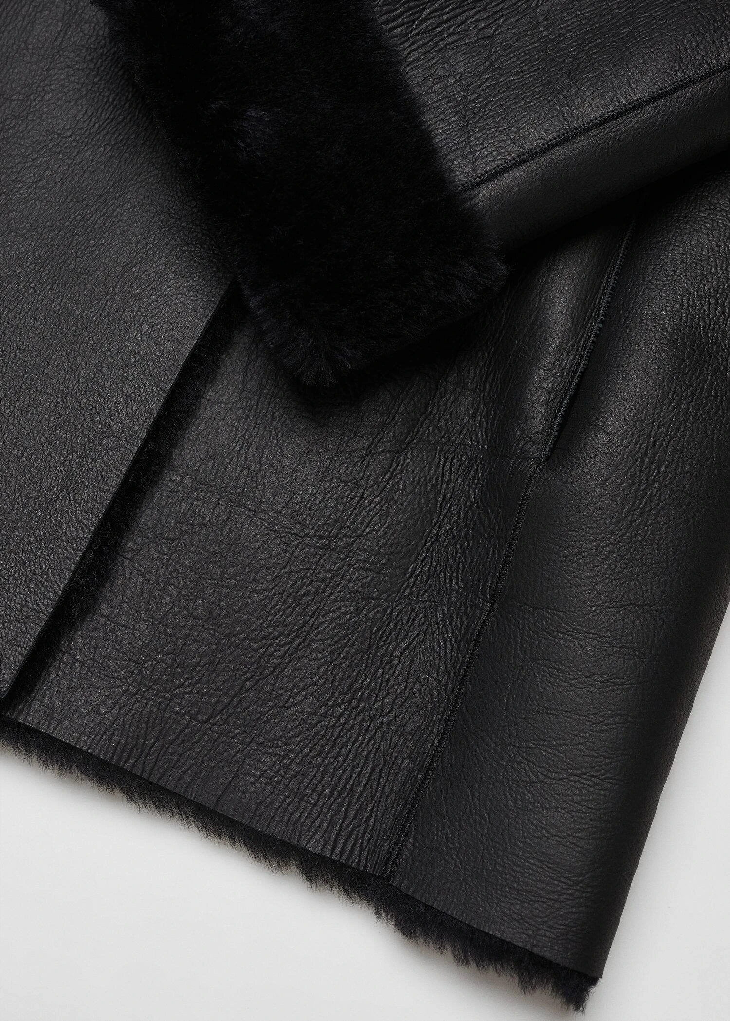 100 % cuir ovin, double face, reversible, coupe droite, col en v avec rabat, manches longues, fermeture a double boutonnage, interieur en fourrureComposition: 100% cuir de mouton avec poils