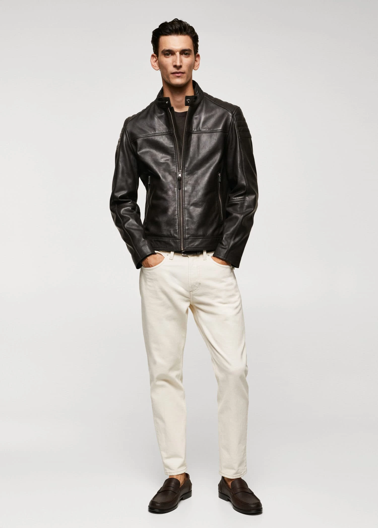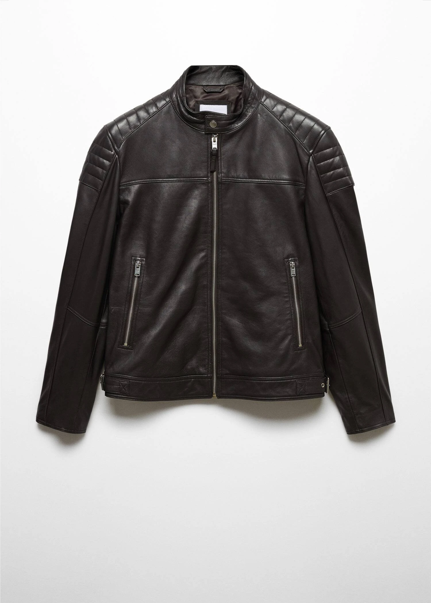 100 % cuir nappa, slim-fit, style biker, col cheminee a bouton, fermeture eclair a l’avant, empiecements matelasses sur les epaules, manches longues, deux poches zippees sur le devant, boucles laterales reglables, bas droit, doublure, poche interieure zippee, le mannequin mesure 190 cm et porte une taille m, le cuir est un materiau delicat qui developpe naturellement une patine dont il faut prendre soin. pour conserver vos produits en cuir en bon etat, nous vous conseillons de les tenir a l’ecart de la poussiere et de les nettoyer si necessaire avec un chiffon doux en effectuant des mouvements circulaires.Composition: 100% cuir ovin. Doublure: 55% polyester,45% viscose. Doublure poches: 100% coton