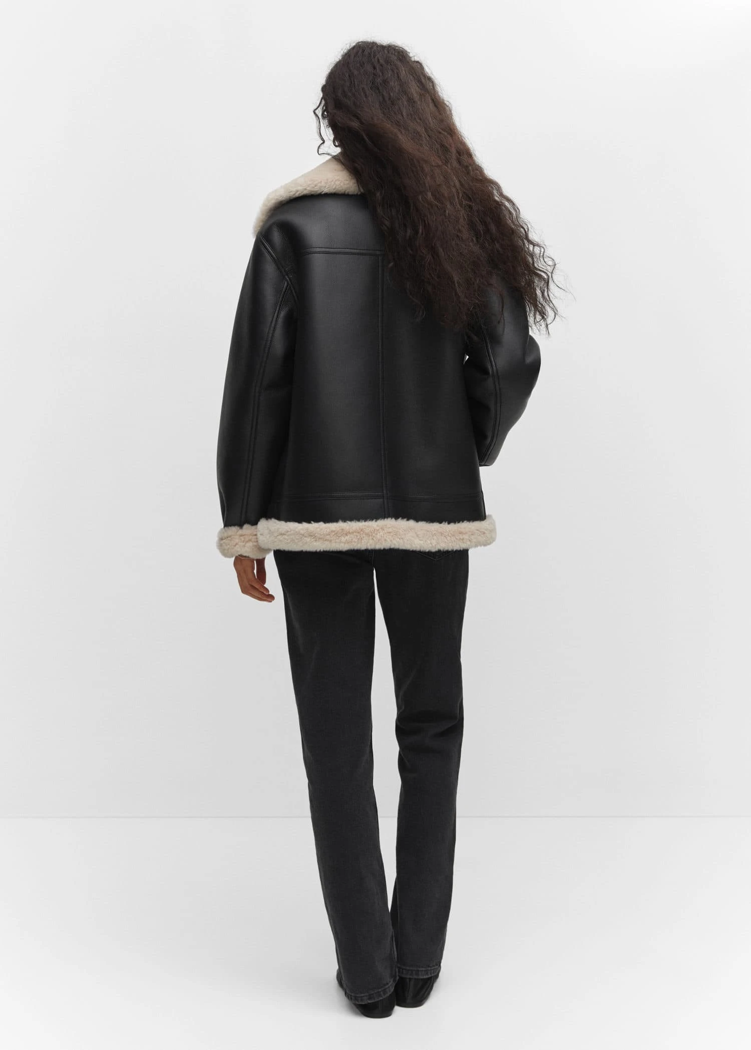 similicuir, structure lourde, double face, style biker, droit, col a revers, col moutonne, manches longues, fermeture eclair sur le devant, deux poches zippees sur les cotes, interieur moutonnee, bords moutonnesComposition: 100% polyester. Revêtement: 100% polyurethane. Doublure poches: 100% polyester